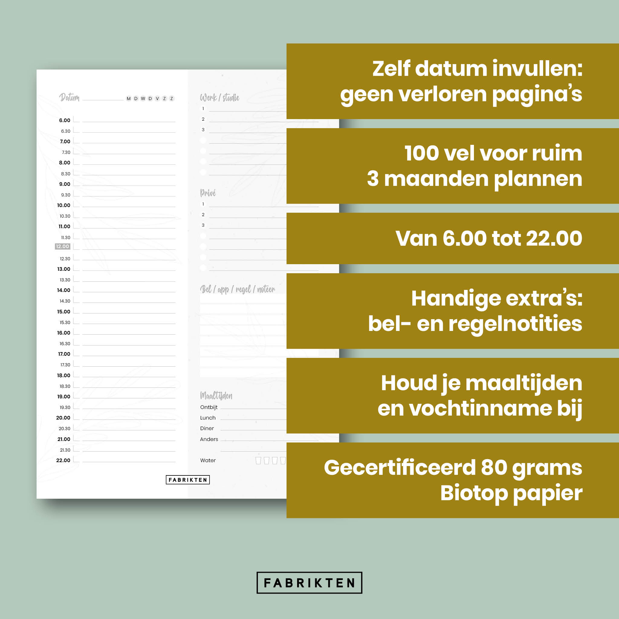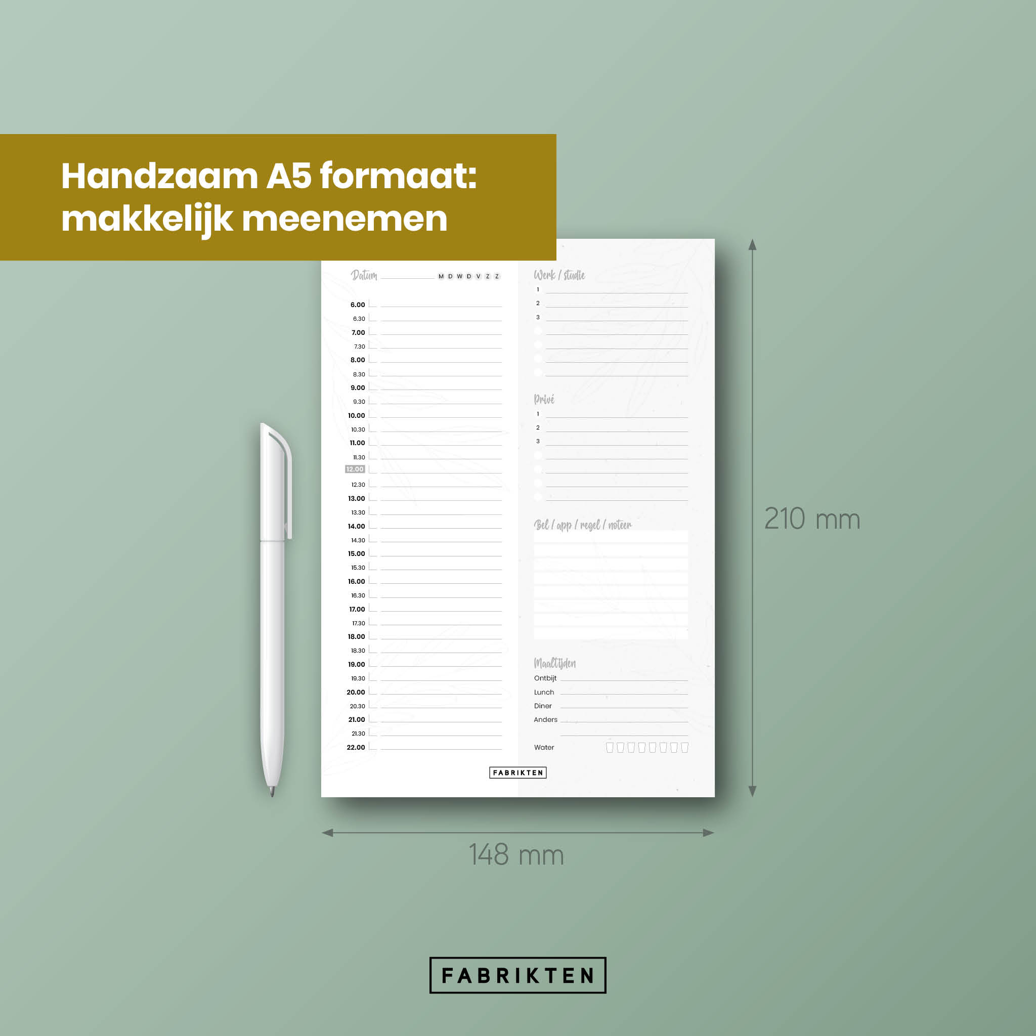 Ben jij klaar voor een dag vol structuur en overzicht, zonder gedoe? Onze milieubewuste A5 dagplanner is dé oplossing voor iedereen die overzicht wil. Of je nu een drukke professional, een student, ADHD, ADD of autisme hebt of een multitaskende ouder bent.