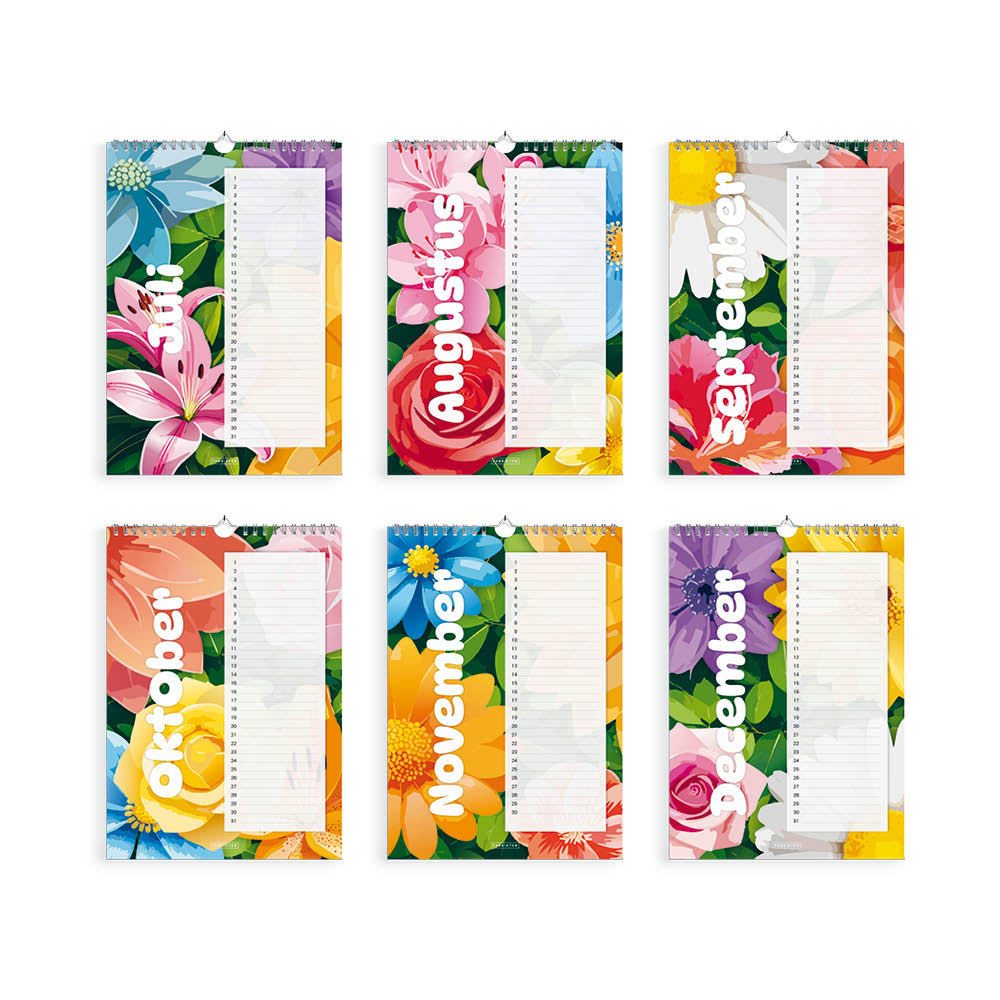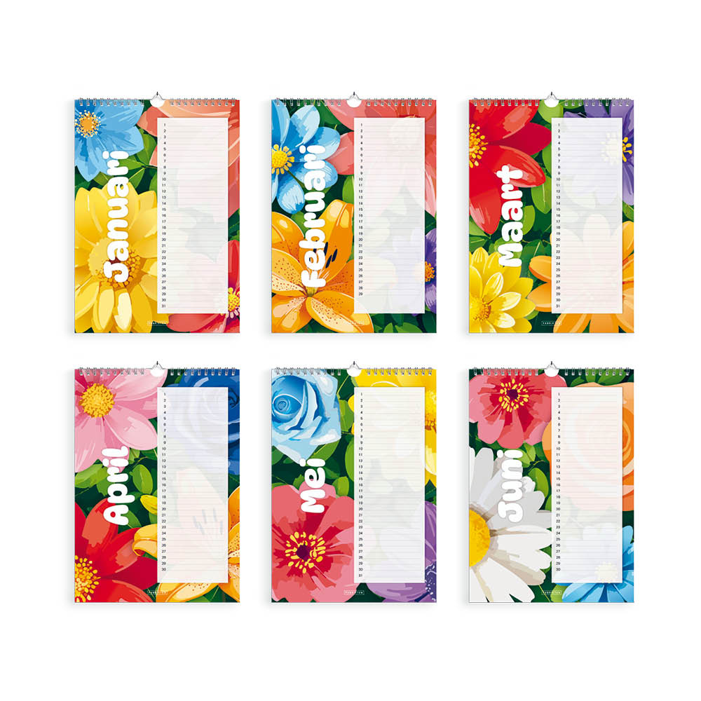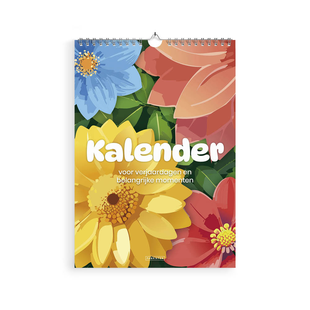 Deze handige kalender op A4 formaat (21 x 29,7 cm) is de ideale oplossing om alle verjaardagen en andere speciale dagen jaar na jaar bij te houden. Dankzij de vrolijke en helder gekleurde illustraties van grote bloemen in strakke vector stijl, is deze kalender niet alleen praktisch, maar ook een echte blikvanger. Je kunt met deze niet-jaargebonden kalender op elk moment van het jaar beginnen.