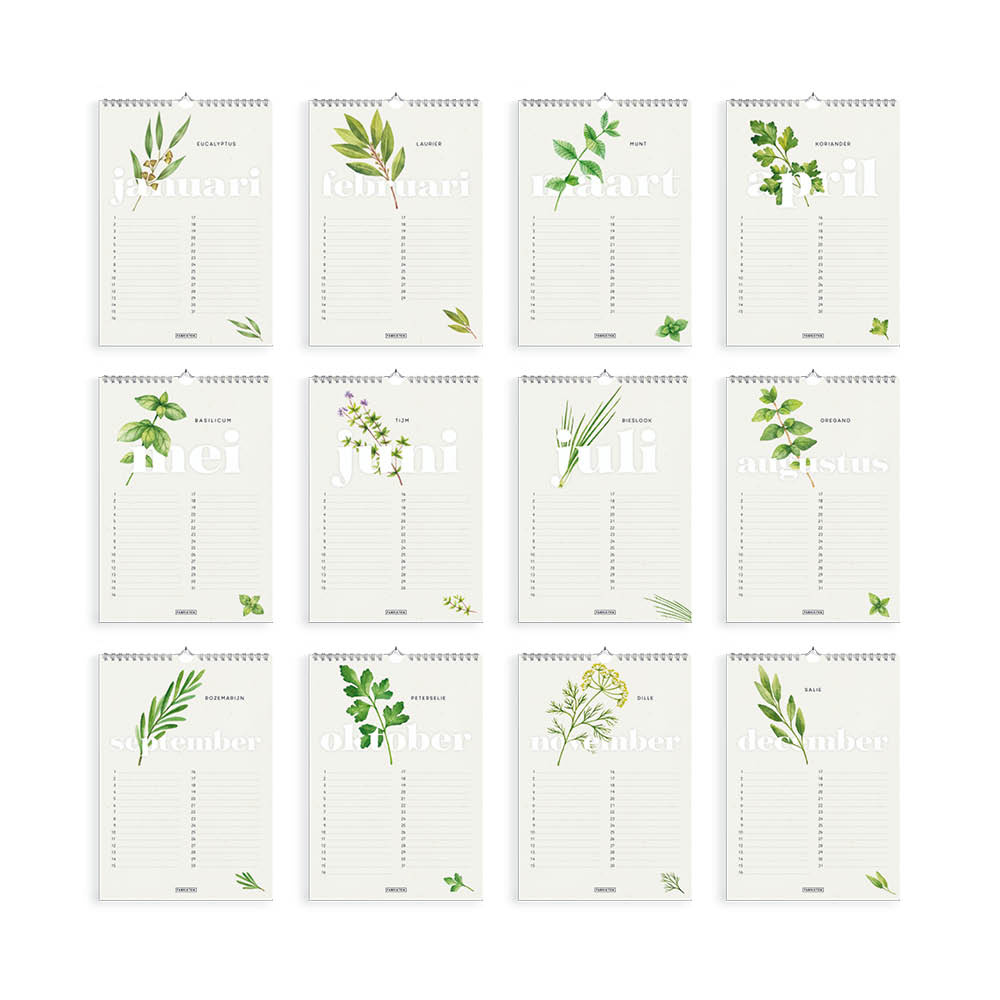Met 7,7 cm schrijfruimte per datum heb je veel ruimte om meerdere verjaardagen en andere belangrijke gebeurtenissen op te schrijven. Elke maand is verfraaid met een prachtige botanische waterverfillustratie in full-colour, waarin je bekende kruiden zoals eucalyptus, laurier, munt, koriander, basilicum, tijm, bieslook, oregano, rozemarijn, peterselie, dille en salie kunt ontdekken.